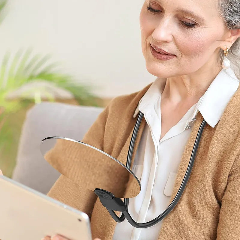 Ergonomisches, freihändiges Design Der mit Silikon beschichtete Schwanenhals des Vergrößerungsglases ist sowohl robust als auch flexibel, sodass Sie ihn problemlos im idealen Winkel einstellen können. Ob im Sitzen, Stehen oder Liegen, dieses Vergrößerungsglas passt sich Ihrer Position an und bietet einen komfortablen Blick. Der Nackenriemen ist für maximalen Komfort gestaltet und bleibt stabil, ohne zu verrutschen, sodass Sie es den ganzen Tag über ohne Beschwerden verwenden können. Zudem lässt sich die Linse nach Bedarf sowohl vertikal als auch horizontal anpassen.