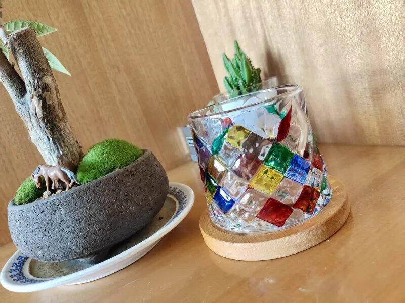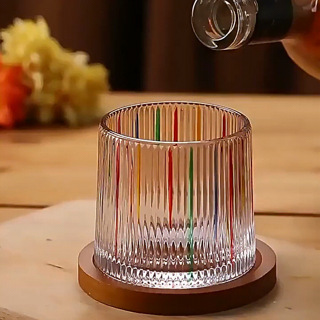 Dank des drehbaren Bodens kann sich das Glas sowohl auf dem Untersetzer als auch direkt auf dem Tisch sanft drehen. Licht und Farbe entfalten sich bei jedem Schluck – ein echter Hingucker bei jedem Drink.